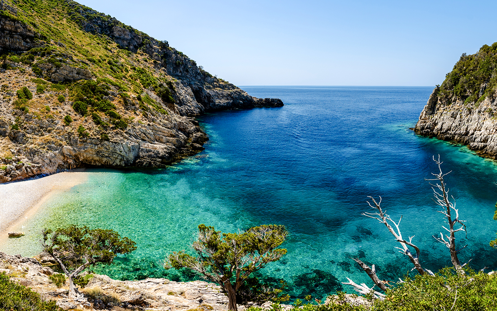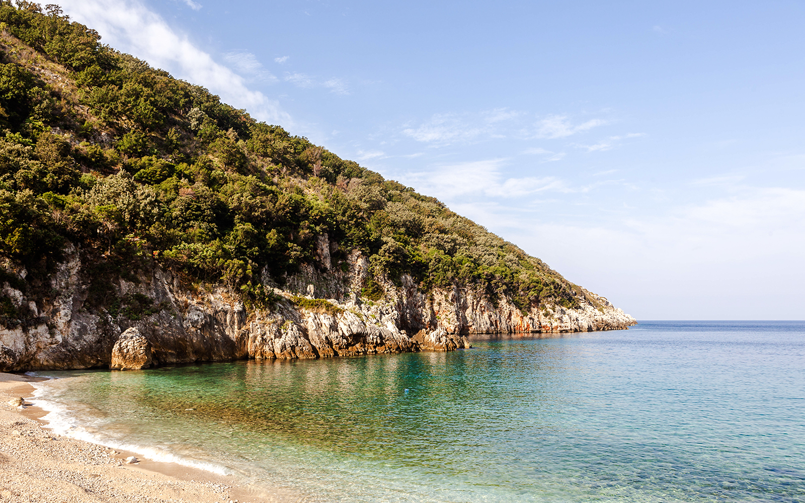 Uma enseada isolada das Ilhas Jônicas emoldurada por penhascos dramáticos, conhecida por suas águas cristalinas e pela calma total, ideal para nadar.
